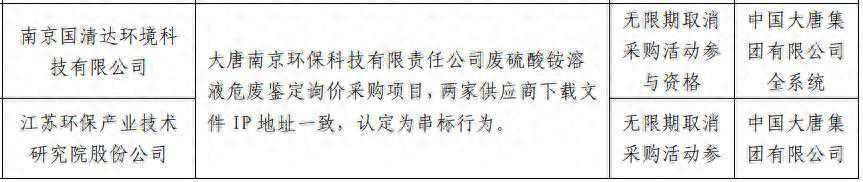 公告显示,大唐南京环保科技有限责任公司废硫酸铵溶液危废鉴定询价采购项目,南京国清达环境科技有限公司与江苏环保产业技术研究院股份公司两家供应商下载文件IP地址一致,认定为串标行为。